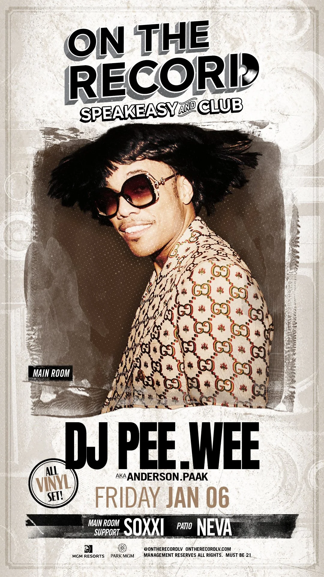 DJ Pee .Wee, aka Anderson .Paak, was a recurring special guest during An Evening with Silk Sonic and Bruno Mars Live in Las Vegas residency shows at Dolby Live. In collaboration with Mac Agency, we developed the all vinyl set concept.